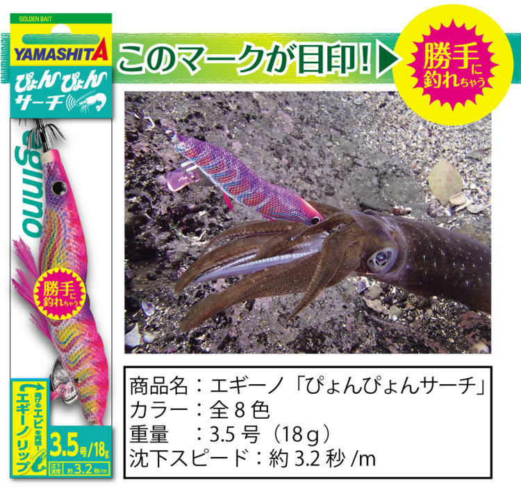 eginnoシリーズ第1弾!ぴょんぴょんサーチ登場!お悩み解決!とにかく「イカが釣りたい」あなたのために=そう、「ぴょんぴょん」を使えば苦手に感じていた「底をとる」、ちょっと不安に思っていた「アクション」、自信が持てなかった「アタリをとる」を気にせずにエギングができるのだ。