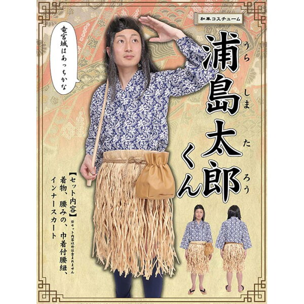 釣竿持って、亀を連れて浦島太郎に変身!●内容:着物、蓑スカート、巾着付腰紐、インナースカート●素材:着物:ポリエステル65%、綿35%、蓑スカート:指定外繊維(紙)100%●対応サイズ(約cm)Men's/身長:〜180cm、B:〜102cm、W:〜98cm、H:〜102cm●寸法 (約cm):着物/70、腰みの/65※注意事項:生産時期により仕様が変更される場合が御座います。