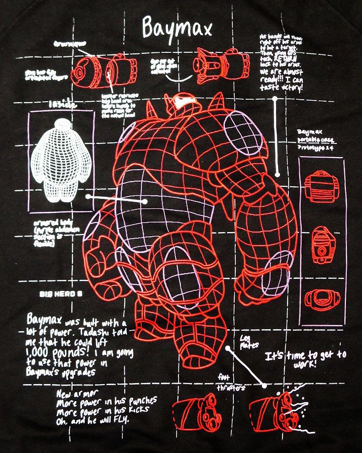 ベイマックスと言えばふわふわっとした大きなイメージですが、作品の後半で登場する、ベイマックスがパワードスーツを身に着けたバージョンの方ですねԅ( ˘ω˘ԅ) ロボット感が強くカッコいいバージョンですね! ボディの設計図のような手書き感あるデザインも面白い♫ 素材:コットン55%・ポリエステル45% サイズ:(アメリカンサイズ) サイズ/部位 着丈(cm) ゆき丈(cm) 身幅(cm) MD 70.5 81.5 51 LG 78.5 86.5 59 ※サイズは平置きでのおおよその寸法です。