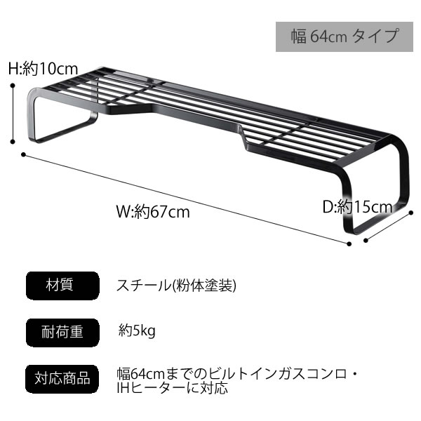 サイズ約W67×D15×H10cm耐荷重約5kg素 材スチール(粉体塗装)備 考■対応サイズ:幅64cmまでのビルトインガスコンロ、IHヒーターに対応 ■ご使用のモニターやパソコン環境によっては、色の見え方に差異が生じる場合がございますが、ご了承ください。